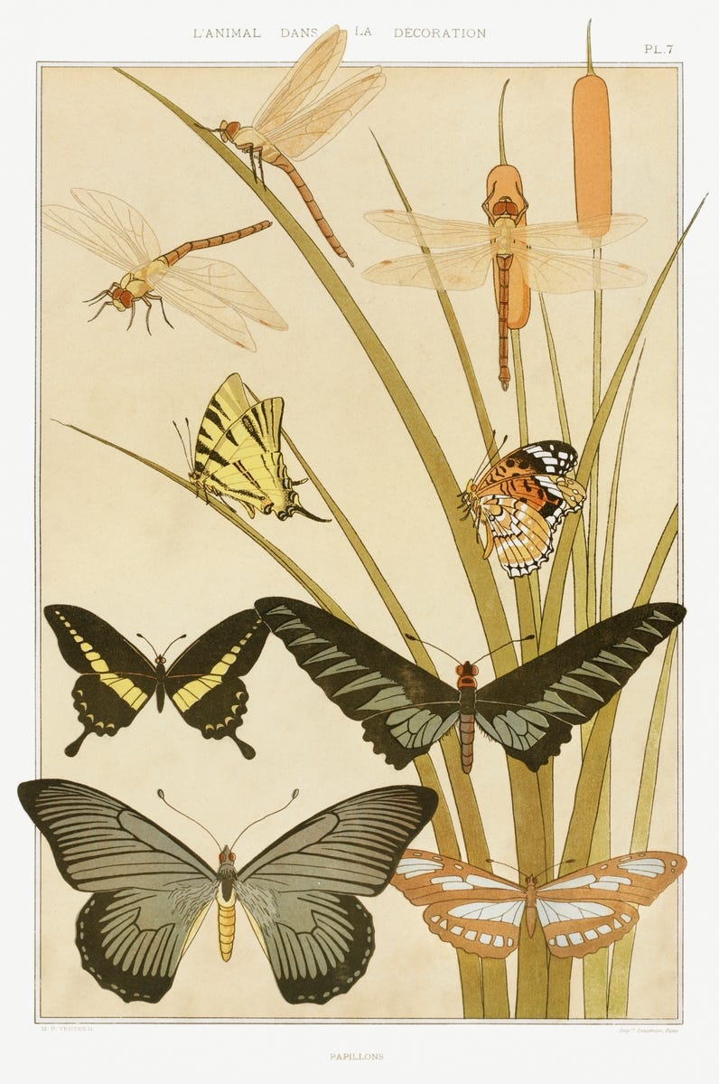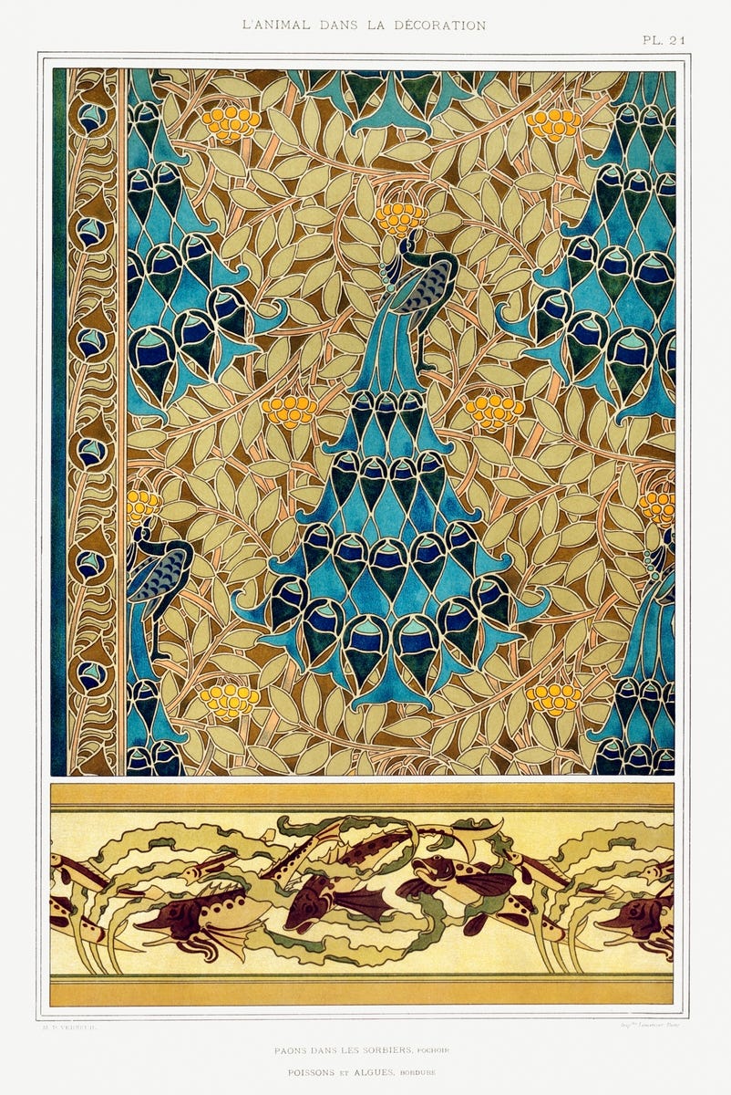These are chromolithographic patterns from L'animal dans la Décoration (1897) by Maurice Pillard Verneuil (1869–1942), French artist and decorator in the Art Nouveau and Art Deco movement. Verneuil studied and developed his style from Eugène Grasset, a Franco-Swiss pioneer of Art Nouveau design. Inspired by Japanese art, nature and particularly the sea. He is known for his contributions to the Art Deco movement through the use of bold floral designs on ceramic tiles, wallpapers, textiles, and posters. (From Raw Pixel)